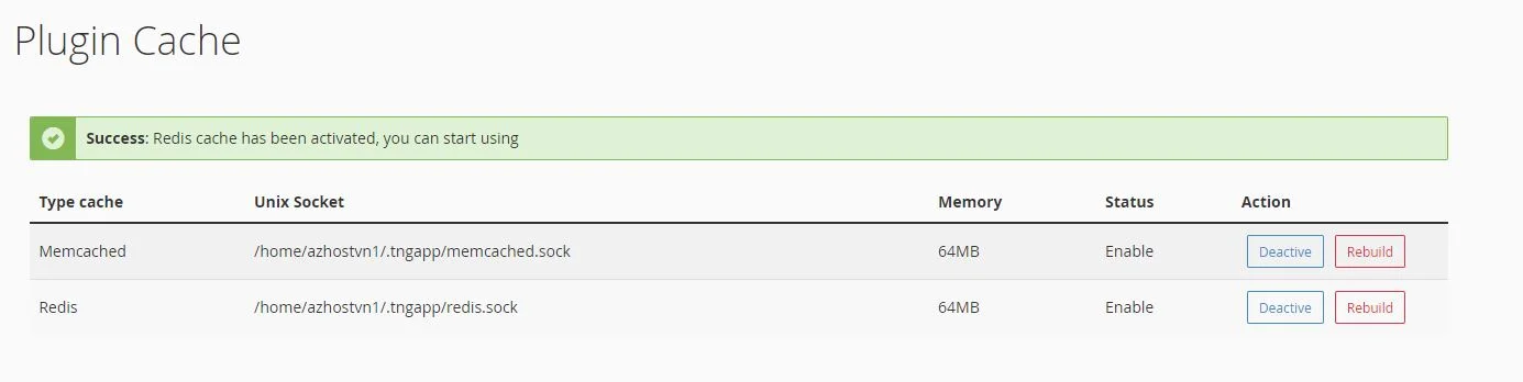 Sau khi bật chức năng Memcached và Redis thì bạn sẽ nhận được thông báo trạng thái gồm :