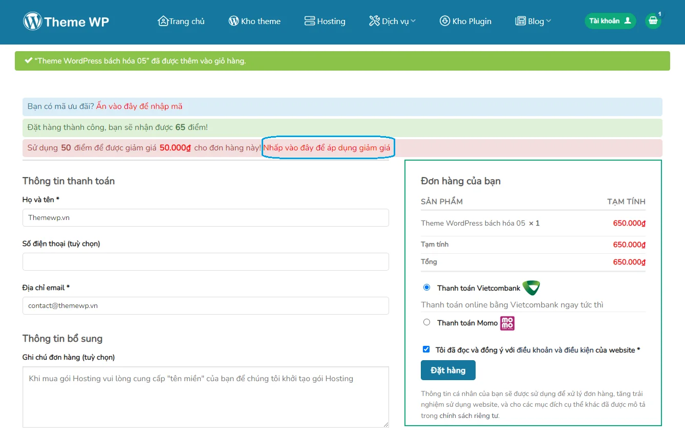 Sau khi nạp tiền tài khoản bạn có được một số lượng điểm thưởng, khi mua theme vào phần thanh toán, bạn sẽ thấy thông báo cách hình thức thanh toán, bạn sử dụng hình thức bằng sử dụng điểm để hoàn tất đơn hàng.