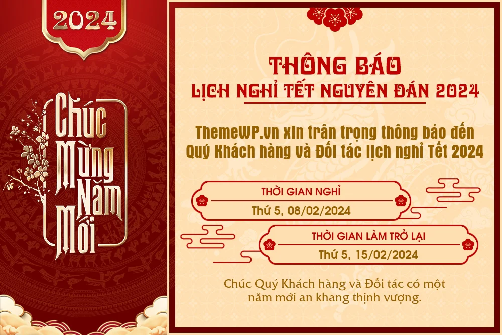 ThemeWP.vn xin gửi tới Quý khách hàng / Quý đối tác thời gian nghỉ Tết Nguyên đán – Giáp Thìn 2024 như sau: